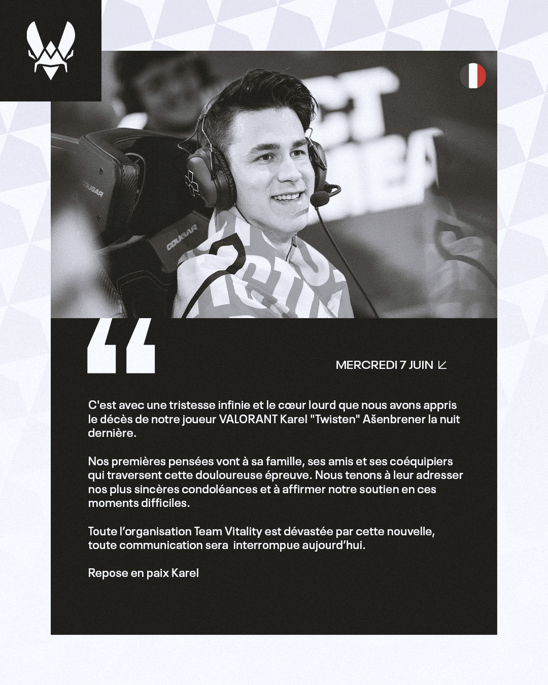 Ce mercredi midi, Vitality a communiqué avec une profonde tristesse le décès de son joueur tchèque Karel « Twisten » Ašenbrener, âgé seulement de 19 ans.