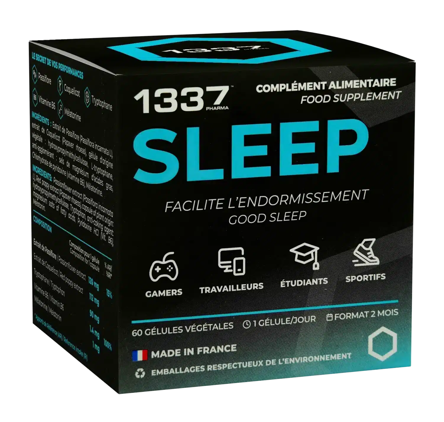 Chez 1337 Pharma, nous avons conçu le complément alimentaire qui permet à tout gamer de profiter d’un sommeil long et réparateur. La mélatonine permet de réduire l’effet du décalage, le coquelicot permet un endormissement rapide et la valériane améliore la qualité du sommeil. Et enfin, la vitamine B5 permet de réduire le stress et la fatigue. Le complément alimentaire pour gamer 1337 Sleep est l’allié idéal pour tout gamer qui souhaite retrouver un sommeil réparateur et être au maximum de ses performances in-game.